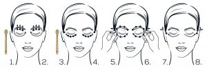 (1) Begin the massage with circular motions around the eyes. Next, (2) press the points under the eyebrows with a gentle lifting motion, starting from the inner corner of the eye and proceeding towards the temple. Count to three for each lifting motion. (3) Make a stroking motion over and then under the eye, starting from the inner corner and proceeding towards the temple. (4) Press the points under the eye from its inner corner to the temple. Proceed to pressing temple points. Count to three for each point. Complete the rest of the massage using your fingertips. (5) With two fingers, tap the circular muscles of the eye. (6) Next, tweak the skin simultaneously on both sides. (7) Apply alternating flattening and lifting movements on the temples. (8) At the end of the eye massage, use a soothing stroking motion above and below the eye, going from its inner corner to the temple and ending with massaging the temple. Proceed to mouth massage.