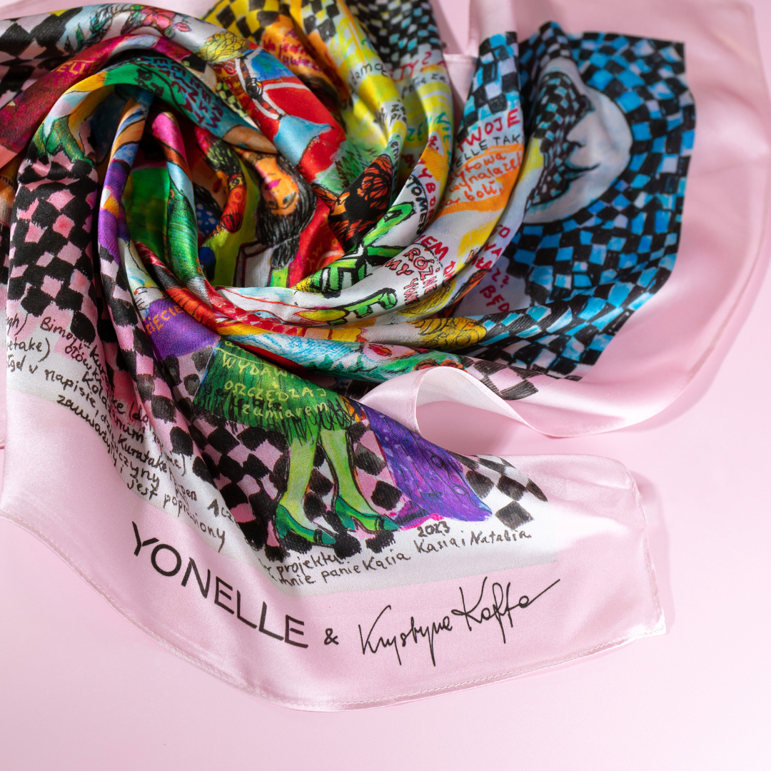 A „Damy YONELLE” selyemsál a kiemelkedő képzőművész és a márka barátja, Krystyna Kofta együttműködésének eredménye. Az irodalmi „Damy YONELLE” festmény varázsa, amelyet kifejezetten számunkra festettek, átkerült a nemes selyemre, harmonikus kapcsolatot teremtve a művészet és a divat között.