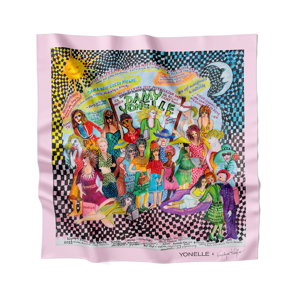 Jedwabna apaszka „Damy YONELLE”, to efekt współpracy z wybitną artystką sztuk pięknych, mistrzynią obrazu i słowa oraz przyjaciółką marki YONELLE – Krystyną Koftą, a prywatnie również miłośniczką i kolekcjonerką apaszek.