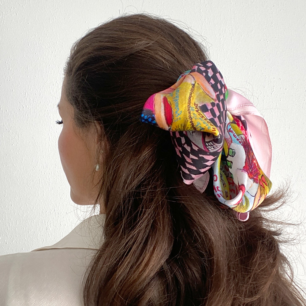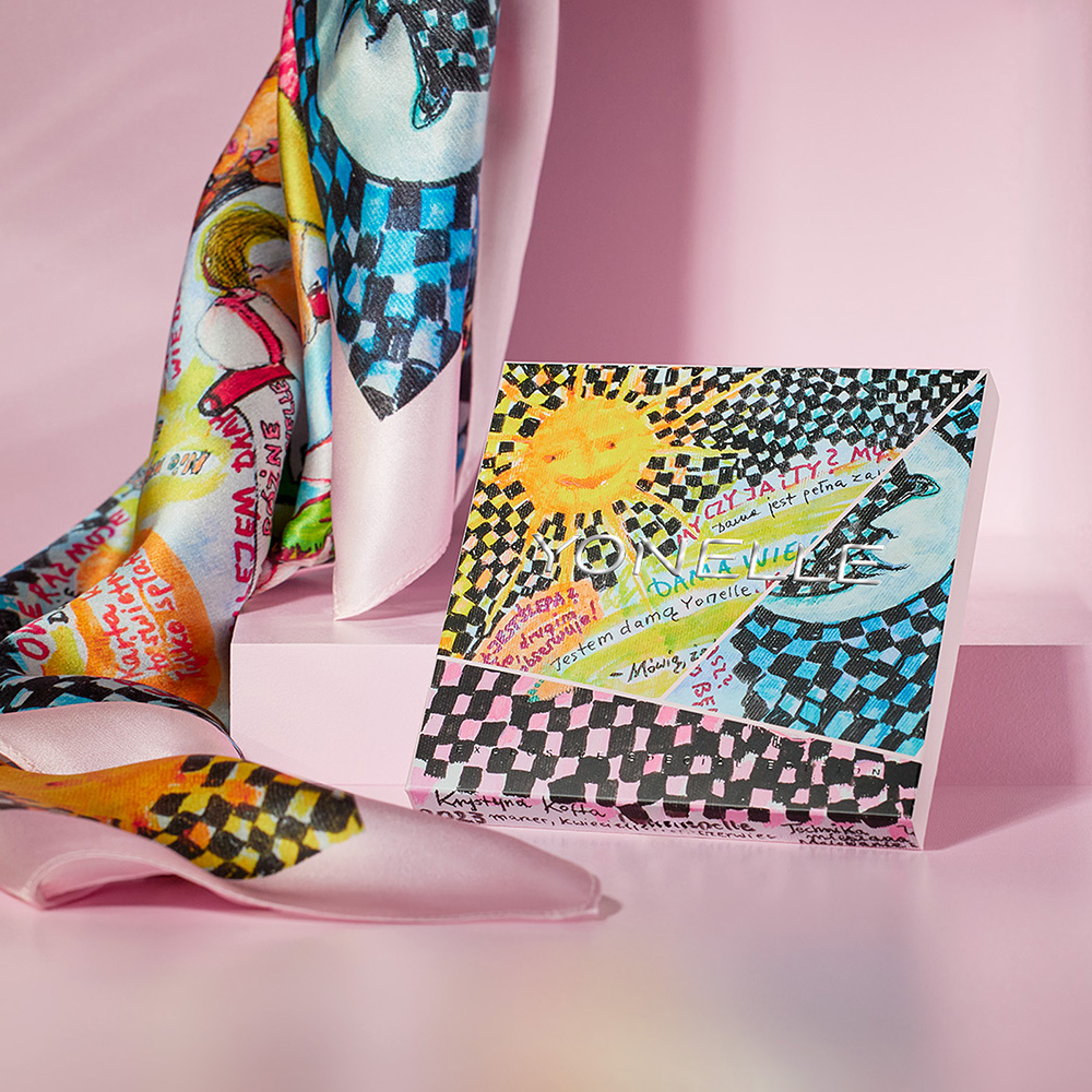 Magia namalowanego specjalnie dla YONELLE obrazu literackiego „Damy YONELLE”, została przeniesiona z płótna na szlachetny jedwab, tworząc harmonijne połączenie między sztuką, a modą. W każdy detalu apaszki zachowano głębię i emocje, jakie płyną z oryginalnej pracy, bo niezwykły kalejdoskop „Dam YONELLE” to coś więcej niż obraz. To celebracja wielowymiarowej kobiecości.